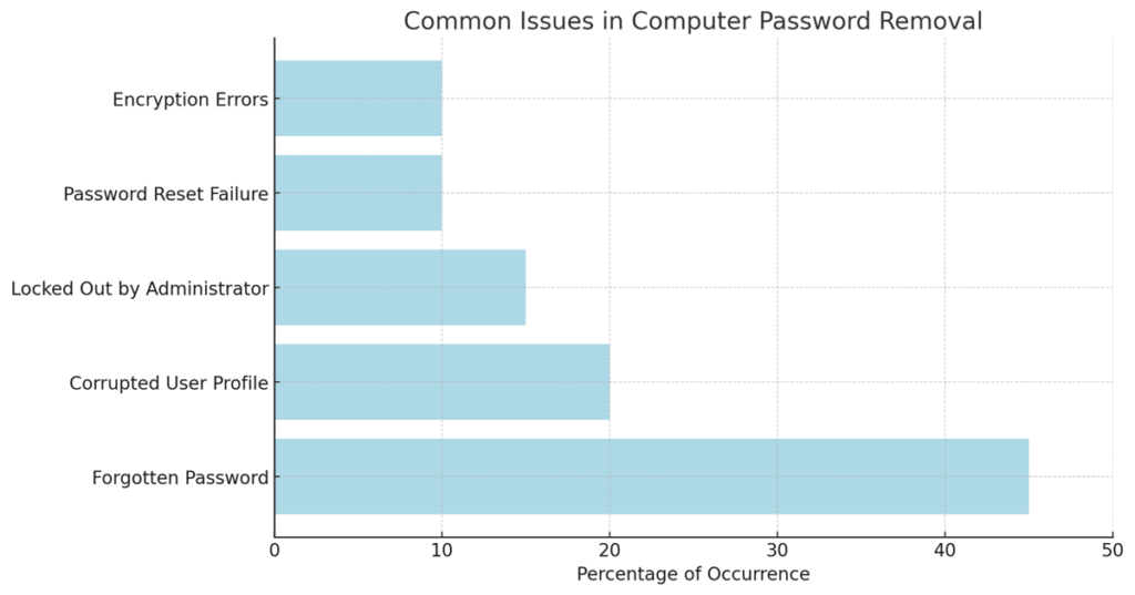 The chart showcases the most common issues encountered during computer password removal services. Forgotten passwords are by far the most prevalent issue, making up around 40% of the cases. Other frequent problems include locked-out administrator accounts and corrupted user profiles, both of which require specialized approaches to bypass or reset access.